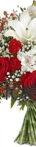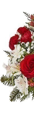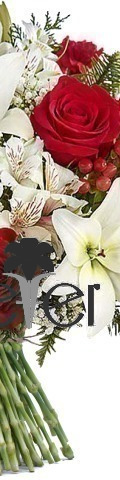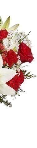 A stylish arrangement for romantic occasions. The "Crush on You" Flower Arrangement includes an elegant selection of red and white blooms. A popular gift choice for friends and loved ones, it features 4 red roses, 2 white lilies, red spray carnations, white alstroemeria, a sprinkling of gypsophila, and seasonal green foliage. The perfect way to say "Happy Valentines Day" or "Season's Greetings" at Christmas, it is a stunning flower arrangement for the workplace and the home.