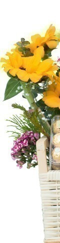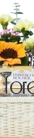 A gift for any occasion, or no occasion at all, the Teddy Bear Delivery Gift Basket remains a popular choice for birthdays, Valentine's Day, housewarmings, and Christmas. Featuring a gorgeous wicker basket filled with delights, it includes a 20cm white teddy bear, a box of 16 Ferrero Rocher, a bottle of Italian red wine, and a gorgeous floral arrangement including 3 sunflowers, 2 pink roses, 3 cream carnations, pink bouvardia and luxuriant eucalyptus stems.